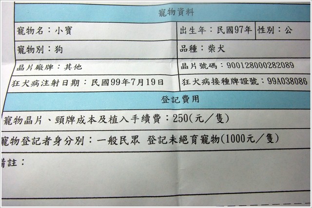 還真是煞有其事,註明了名字、出生年、性別和品種,在行政院的寵物登記管理資訊網中算是登記有案了。