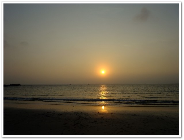 真得很美,不枉費我們繞路+問路+騎過頭。這邊看夕陽的角度絕佳,可以從正前方看著夕陽緩緩落入海平面下,除了有一座涼亭可以遮陽外,沙灘上也散落了一些石頭可以坐在上面欣賞。而且這裡的沙子不黏腳喔,踏起來不會有黏膩的感覺。