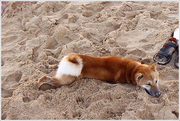山水沙灘是近年來新發展出來的熱門景點,所以不論是設施及遊客都多了不少,看到不少人在戲水或是衝浪。小寶特愛這邊的沙子,玩的不亦樂乎,還自己挖了個洞做起沙浴SPA來,真懂得享受。