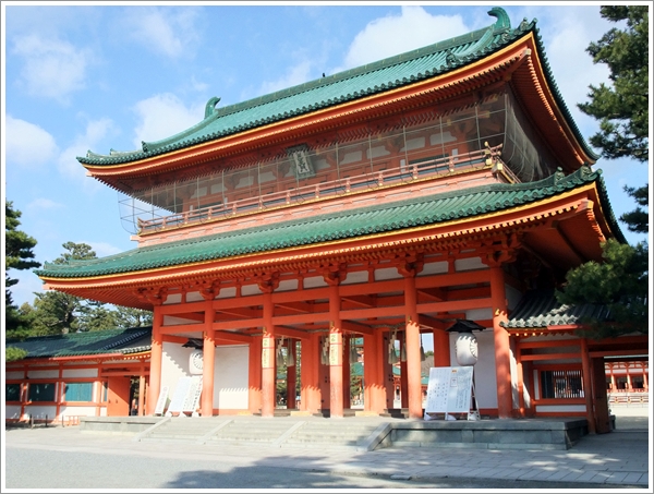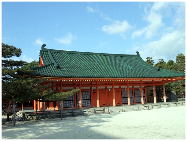 電影「愛情不用翻譯」中,女主角夏綠蒂搭著新幹線來到京都,就是來到平安神宮。夏綠蒂眼中的平安神宮是昏暗的,而我眼中的平安神宮則是陽光、藍天、白砂礫、紅屋和綠屋頂,一個色彩簡單卻很美麗的地方。