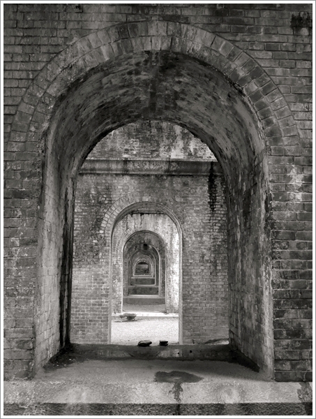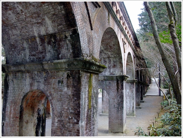 不過南禪寺外的水路閣和三門倒是讓我們停駐了許久。水路閣是琵琶湖的疏水道,屬於羅馬式的高架引水道,乍看之下很像我們苗栗的龍騰斷橋吧,不過他沒斷喔,橋的上面至今都還是流水潺潺。水路閣獨特的造型還可以讓我們在這兒大玩相機的復古效果和景深效果。