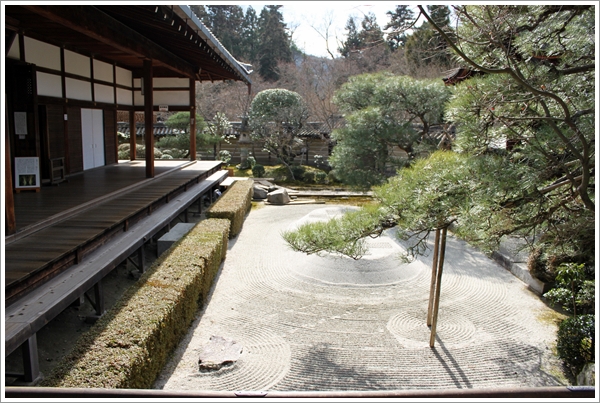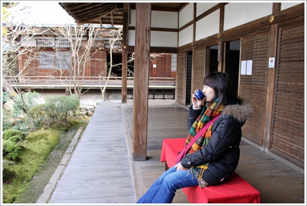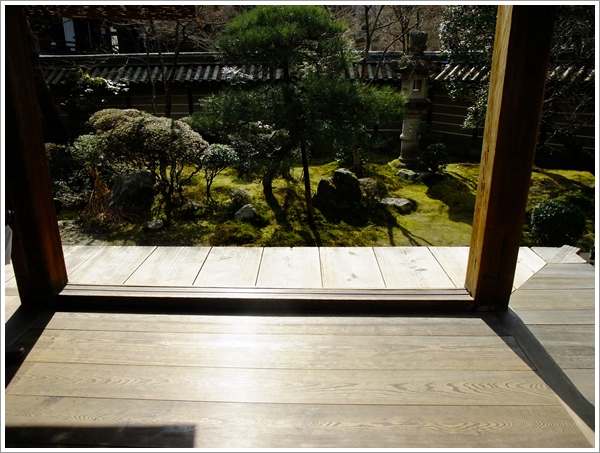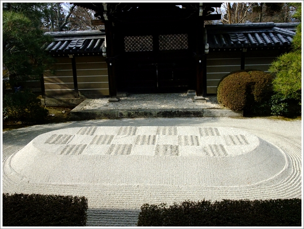 從大玄關進入後要脫鞋,冬天踩在冷冰冰的木地板上,就算有穿著毛襪也會馬上感到一陣冰冷,幸好都有提供拖鞋可以換穿。順著迴廊走,首先會先看到庭園中的白沙棋盤,這由沙子堆疊而成的造景不禁令我莞爾一笑,小心翼翼的刷出棋盤的樣式,只能說日本人的創意滿分啦。