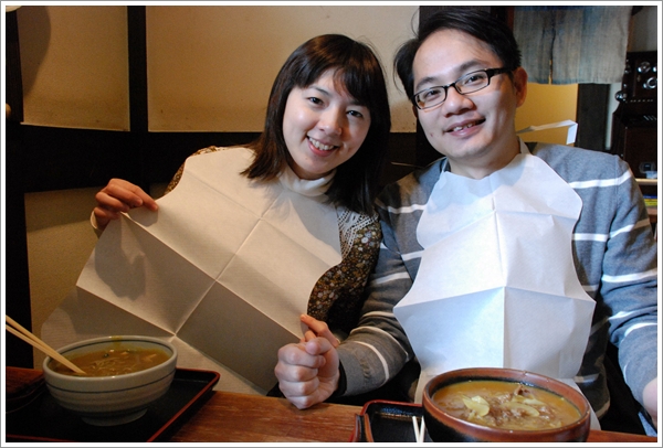 為了怕咖哩湯汁濺到客人的衣服,店家還提供拋棄式圍兜,不得不承認圍起來真得很好笑!咖哩烏龍麵有牛肉、雞肉、海鮮等口味,也有迷你碗、正常碗、加大碗的選擇。咖哩湯汁很濃厚,不過我個人比較喜歡偏甜的咖哩,所以這家偏辛辣的咖哩就比較不合我味,但是烏龍麵真得很Q彈喔。
